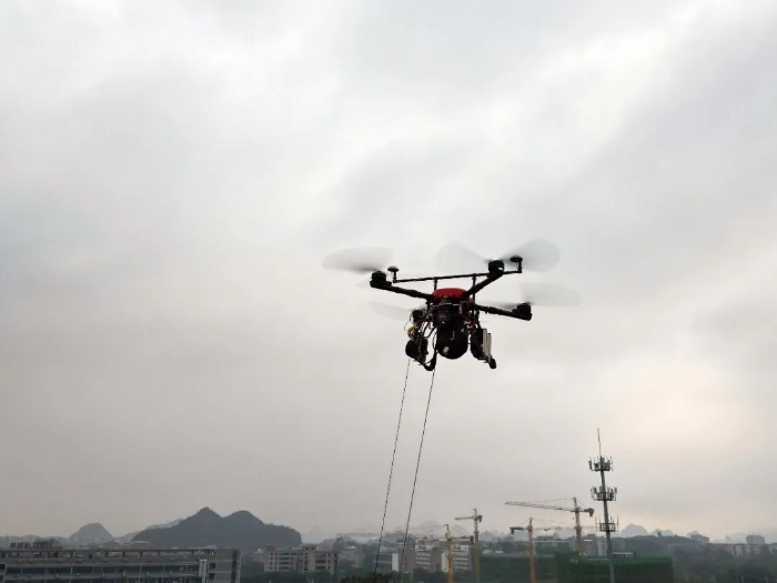 “我這邊準備好了,可以起飛了!”一聲令下,停放在相距數十公里的兩端試驗點上的系留無人機同時起飛,在駕駛員全神貫注地操作下,無人機緩緩升空,并平穩地懸停在上方數十米處。